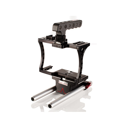 The cage is combine with the Sony A7S baseplate, a V-Lock quick release system, with 15mm 8" rods.