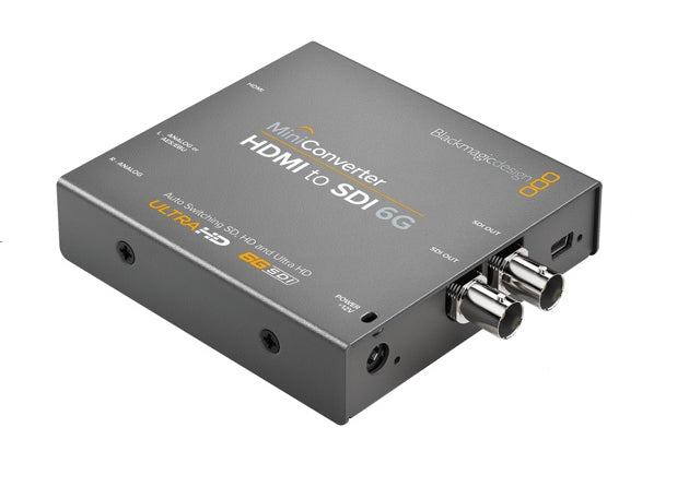 Mini Converter HDMI to SDI 6G includes everything you need to convert from HDMI devices to SDI video in SD, HD and Ultra HD video formats. With independent audio connections you can also embed SDI audio from HDMI, AES/EBU or balanced analog audio inputs. Mini Converter HDMI to SDI 6G is the perfect solution to convert HDMI consumer cameras or computers to broadcast quality SDI!