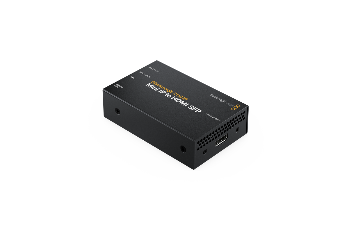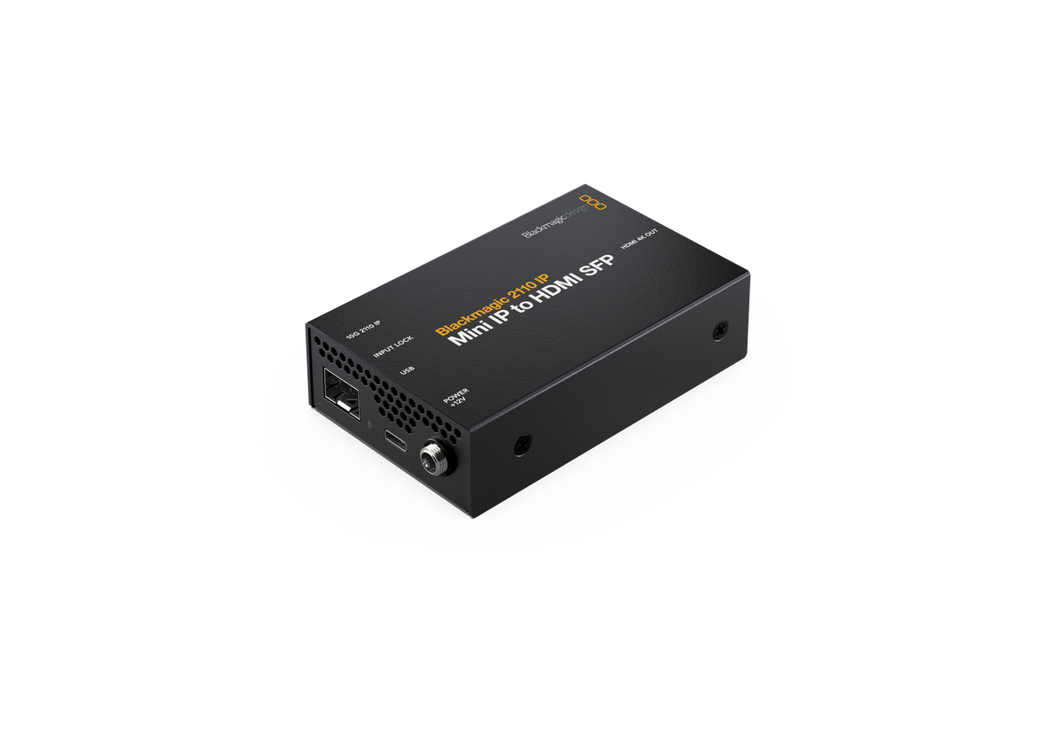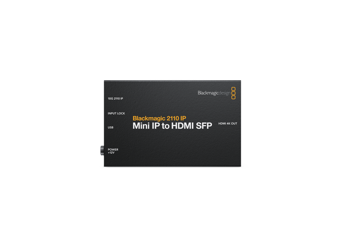 De Blackmagic 2110 IP Mini IP to HDMI SFP is een compacte en krachtige converter die SMPTE-2110 IP video en audio naar HDMI omzet. Deze converter ondersteunt zowel HD als Ultra HD standaarden tot 2160p60 en maakt gebruik van een 10G Ethernet SFP optische module voor verbindingen.