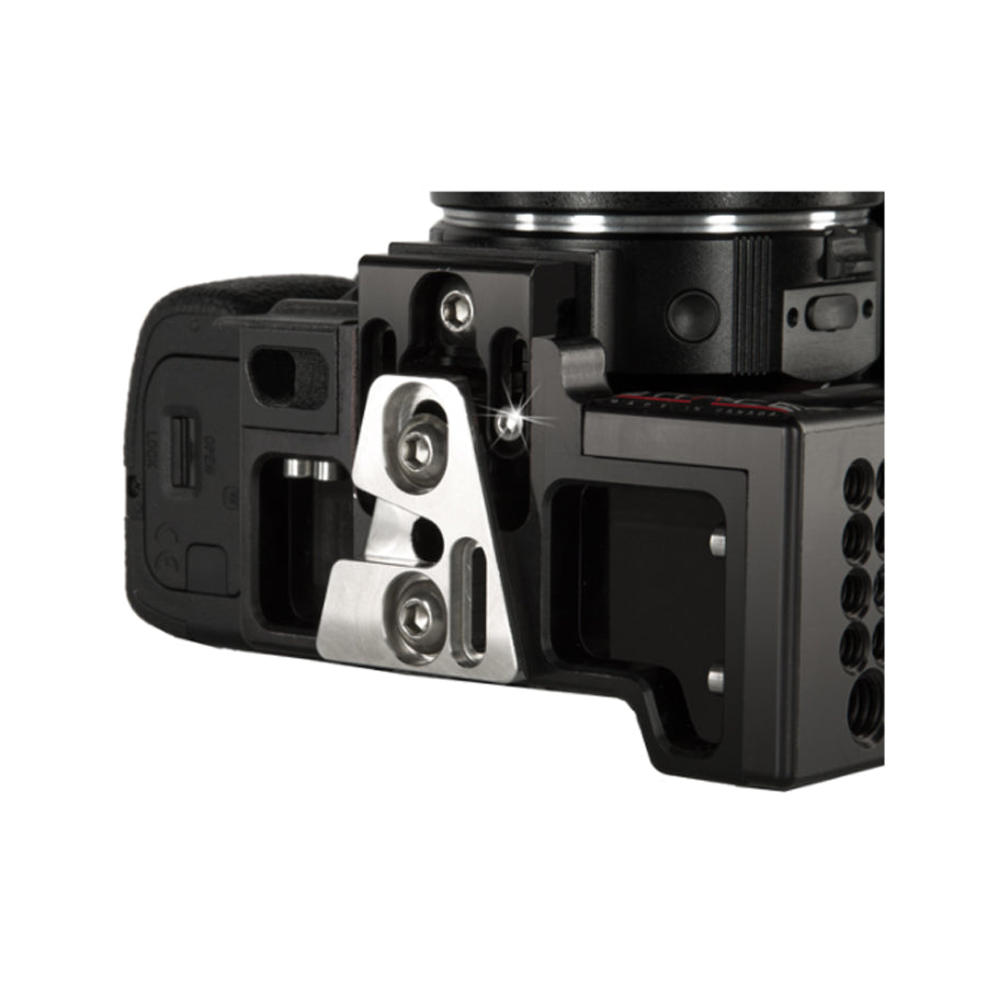 Integrated in the cage, we designed a Metabones® adapter support bracket. When there is no Metabones® adapter, the ¼-20 screw is captive so you don’t have to remove it from the cage and simply slide the bracket from under the cage.